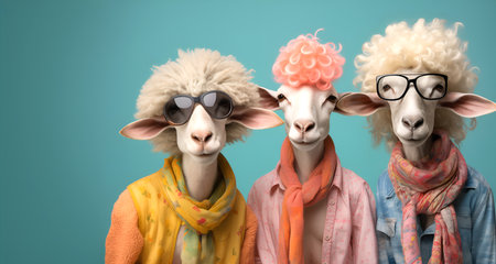 Creative animal concept. Group of sheep lamb in funky Wacky wild mismatch colourful outfits isolated on bright background advertisement, copy space. birthday party invite invitatio