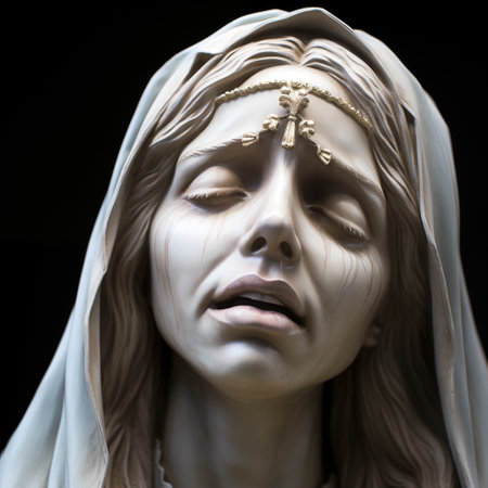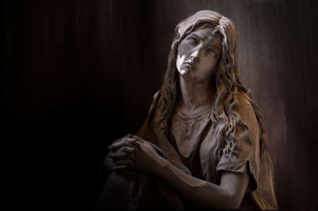 Statue, sculpture. Close-up portrait of a woman taken in a monumental cemetery.