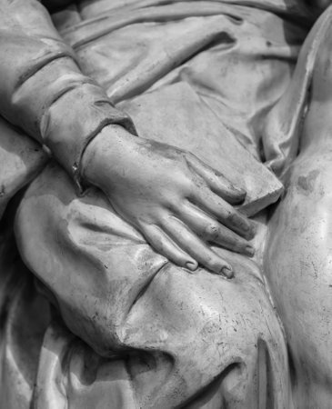 Religious bronze statue representing the piety of Michelangelo. On background a black concrete wall. Space for text. Ideal for religious concepts, and events.