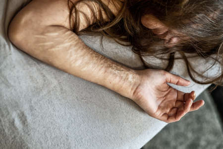 Hand, arm and hair of a woman with heavy cuts and scars of self-mutilation in frustration, self-abusing, borderline personality disorder, copy space