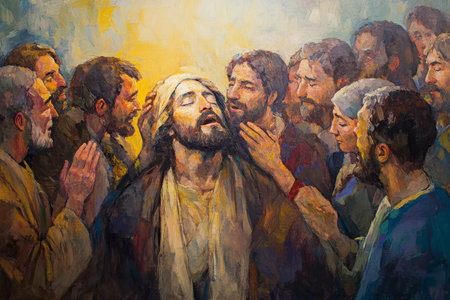 Jesus surrounded by a crowd of people, healing a blind man. The scene uses soft yellows, blues, and greens to convey hope, compassion, and the miracle of sight.