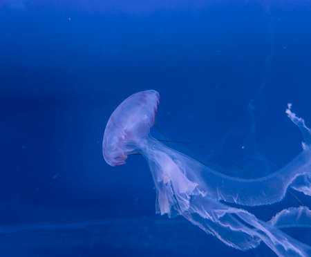 Close-up Jellyfish, Medusa in fish tank with neon light. Jellyfish is free-swimming marine coelenterate with a jellylike bell- or saucer-shaped body that is typically transparent.