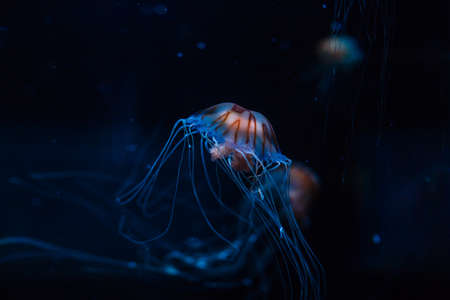 Fluorescent jellyfish swimming underwater aquarium pool with red neon light. The Lion's mane, Cyanea capillata also known as giant jellyfish, arctic red jellyfish, hair jelly