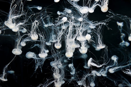 Jellyfish glide effortlessly through dark waters in an aquarium creating a mesmerizing spectacle as they pulse and float.