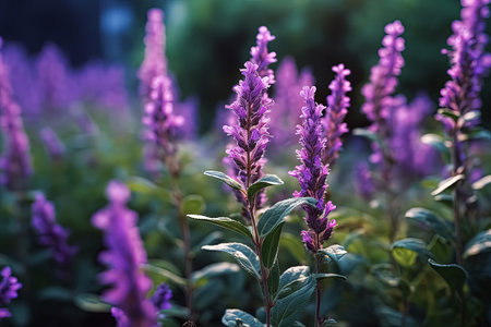 Close up of purple decorative sage flowers field. Beautiful summer garden violet floral bloom background. Salvia Bumbleberry, Woodland Sage. Selective focus.