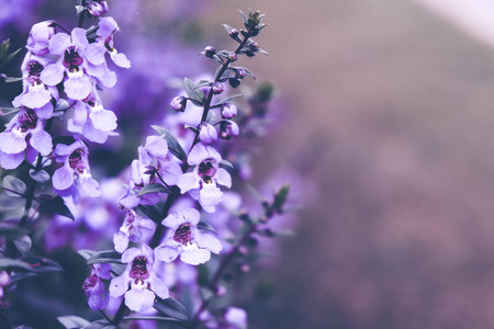 Close-up of a bunch of purple flowers of antirrhinum majus on a stem in the wild