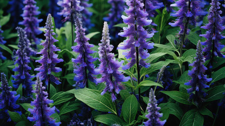 A wide shot of Salvia swaying gently in the wind, realistic photography style, bright and vivid colors, natural lighting.