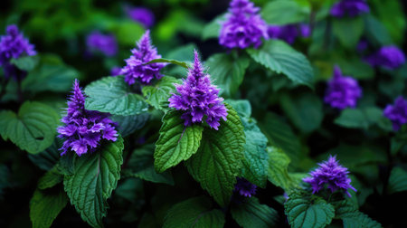 A serene close-up of a mint plant showcasing rich green leaves and delicate purple blossoms, set in a natural environment that highlights beauty and tranquility.