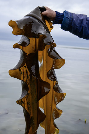 Bull kelp seaweed growing on rocks. Edible sea weed ready to harvest in the ocean