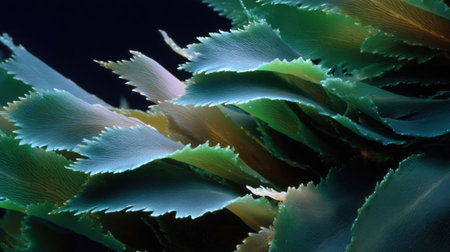 A closeup view of vibrant bioluminescent kelp leaves gently swaying in ocean currents showcasing their intricate textures and the engineered structures that promote efficient carbo