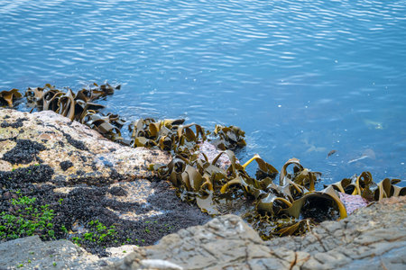 Seaweed and bull kelp growing on rocks in the ocean in australia. Waves moving seaweed over rock and flowing with the tide in Japan. Seaweed farm in australia