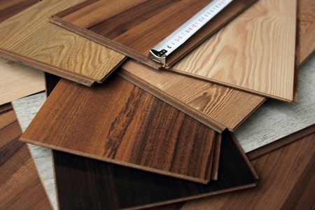 Materials Concept. Top view of wood laminate materials on wooden floor. Interior materials design for home and renovation building. Surface Color Texture of laminate; veneer; parquet; plywood and vinyl floor for Interior designer. Wallpaper for furniture background.