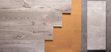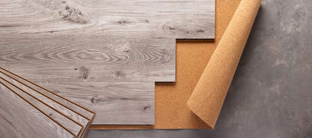 Laminate wood floor on cork background texture. Wooden laminate floor and corkboard with copy space