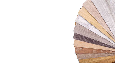 Vinyl and linoleum samples on a white isolated background. Vinyl for flooring with wood grain texture and pattern.