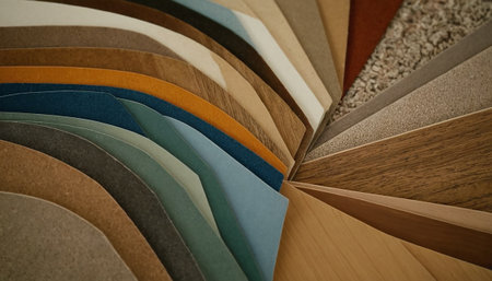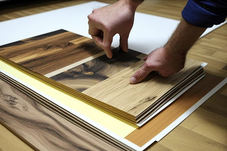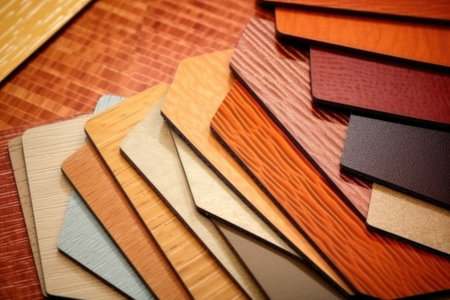 Warm-toned stack of assorted laminate flooring samples laid on a wooden surface, showing texture and color variety. Perfect for interior design inspiration. Generated AI.