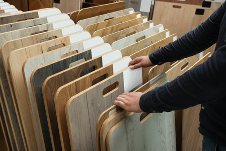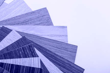Close up of laminated, veneer, engineering wood flooring samples. Wood texture for furniture and flooring furnishing material samples. interior material design samples.