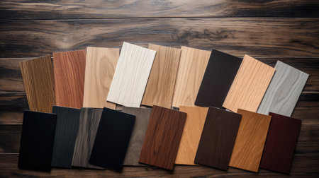 Sample of wood laminated chipboard for furniture design on wooden background with copy space. Color guide displaying a range of hues for use in interior design and decoration, for designers