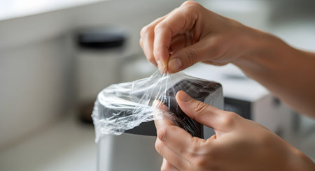 Close-up of hands peeling a thin, transparent protective plastic film off the surface of a new electronic device or appliance. The image captures the satisfaction of unboxing and setting up new equipment.