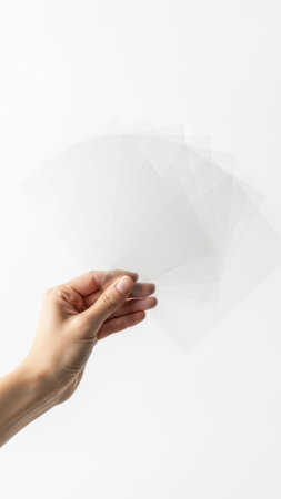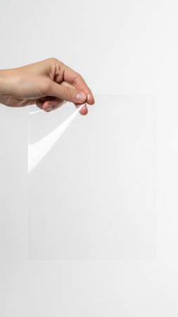 The image depicts a hand holding a clear plastic sheet against a white background. The hand is positioned in such a way that the fingers are visible through the transparent sheet. The white background provides a stark contrast, making the plastic sheet and the hand the focal points of the image. This image is ideal for use in product showcases, educational materials, or design presentations.