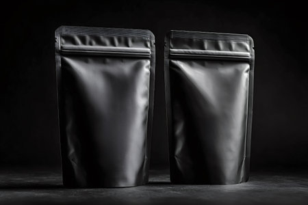 Two black blank doypack pouches with zipper are standing up on dark background, creating a sleek and modern presentation for food or non food products