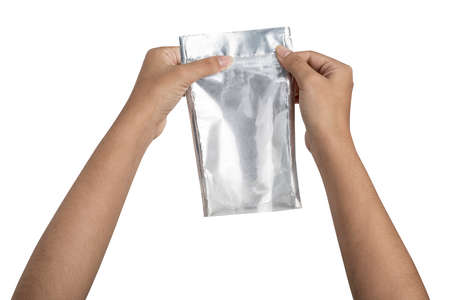 The image features two hands holding metallic foil packages against a white background. The packages are silver and appear to be sealed, with one hand holding the package upright and the other tilting it slightly. The image is clear and SEO-friendly, emphasizing the foil packages and the white background.