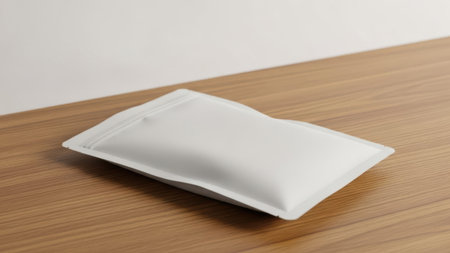 Plain white flexible package, ideal for food, medicine, or small products, resting on a light blue surface with natural sunlight and shadow. minimalist and clean product presentation.