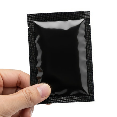 This image features a hand holding a small, sealed aluminum foil packet. The packet is reflective and appears to contain a small item. The background is plain white, providing a clear and uncluttered view of the packet. The image is SEO-friendly and suitable for various applications.