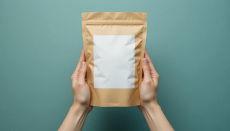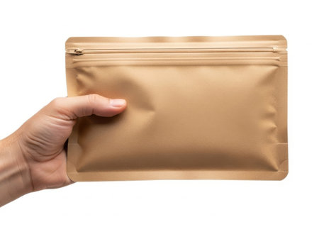 The image features a hand holding a brown paper bag with a zipper closure. The bag is isolated against a white background, making it the focal point of the image. The hand is positioned at the bottom, holding the bag by its sides. The image is clear and SEO-friendly, highlighting the simplicity and functionality of the bag.