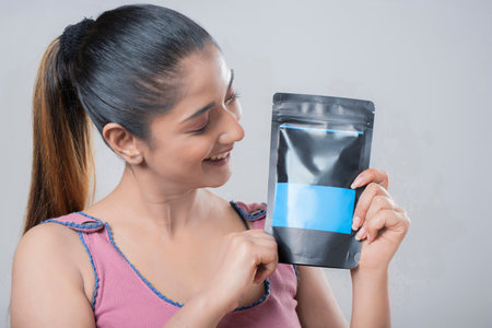 Blank foil food or drink bag on white background in minimal style, natural light shadow. Monochrome photo flat lay. Packaging valve and seal template mockup. Metallic coffee tea retail package design.