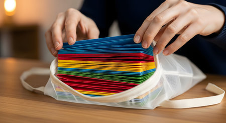 A close-up of a person's hands neatly arranging a stack of colorful envelopes into a white mesh zipper pouch. The envelopes are in vibrant shades of red, blue, yellow, and green, suggesting organization for budgeting, letters, or crafts.