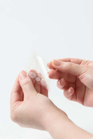 Round patches for acne and wrinkles on the hands on a white background. Acne and wrinkle patches for facial rejuvenation. Facial cleansing cosmetology.