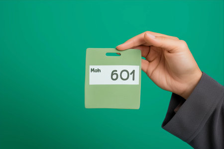 A blank badge mockup with a black lanyard on a clean white background, ideal for branding presentation. Generative AI