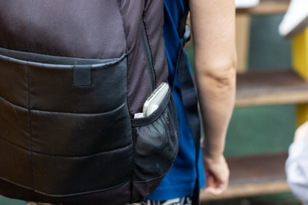 A close-up view of a casual backpack with a smartphone partially visible in its side pocket, perfect for lifestyle and travel imagery.