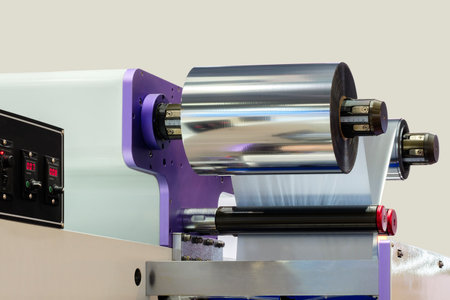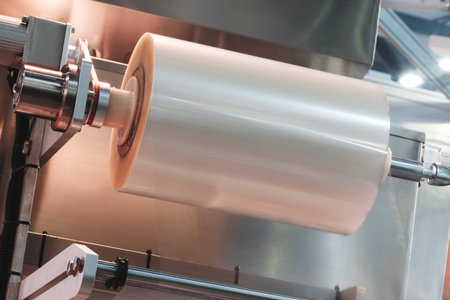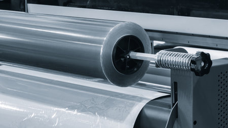 roll of plastic polyethylene film is cut by a food packaging machine. Industrial concept background.