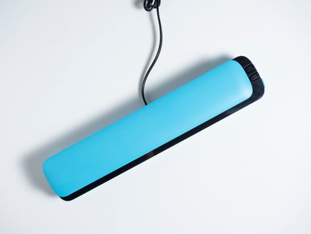 close-up of a blue vacuum packer isolated on a bright blue background. Machine to preserve the freshness of the products. Flat lay, top view.