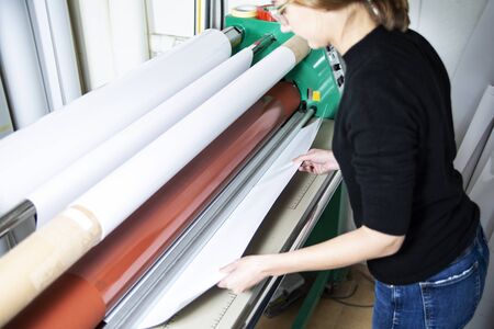 Industrial wide-format printing machine prints advertising posters or banners on paper, advertising concept background.