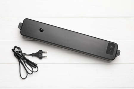 Sealer for vacuum packing with power cord on white wooden table, flat lay