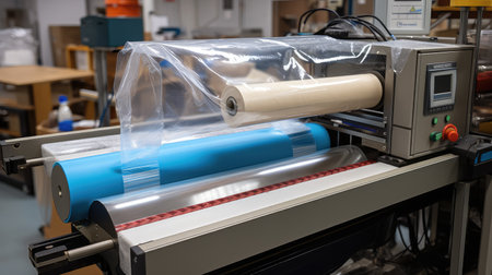 A roll of transparent film on the bar slitter-rewinders.