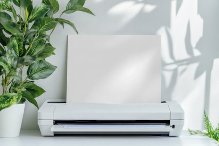 A white printer sits on a desk next to a potted plant. The printer is empty and ready to print. The plant adds a touch of greenery to the room, creating a calming atmosphere
