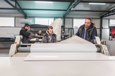 Industrial wide-format printing machine prints advertising posters or banners on paper, advertising concept background.