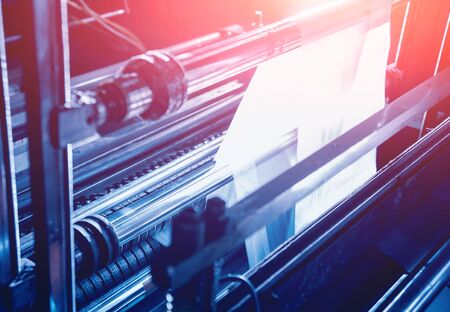 Detailed close up of newspapers being printed on a press machine in a professional printing factory