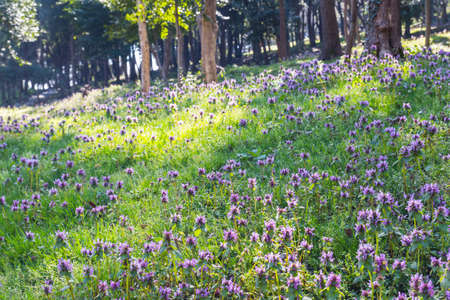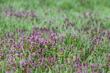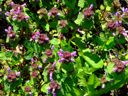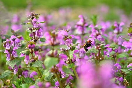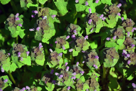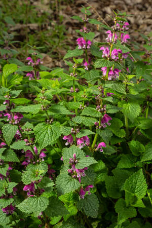 Natural blossoming overgrown purple nettle (Lamium purpureum). This plant is used for nutrition and beekeeping.