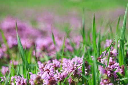 Spring flowers blossom, red dead nettle (Lamium purpureum) with green grass in a background