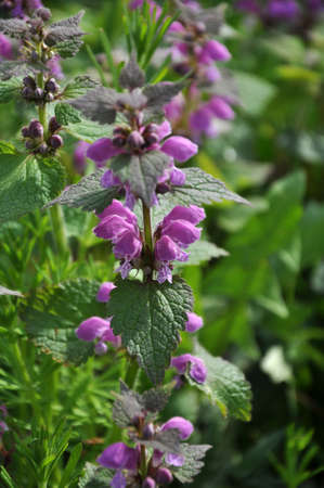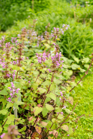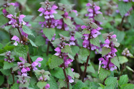 A purple flowers with green leaves growing in a garden. The flowers are small and delicate. Small flowers of the nettle. Thickets spotted dead nettle as background.
