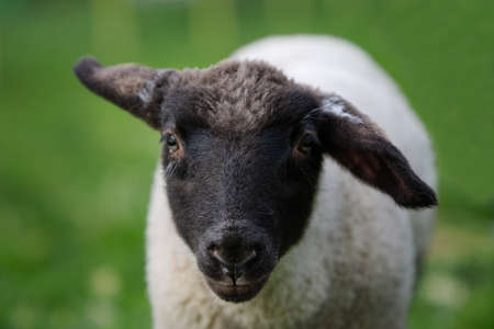 Black faced sheep staring curiously at the camera outdoors in a green pasture in a close up view