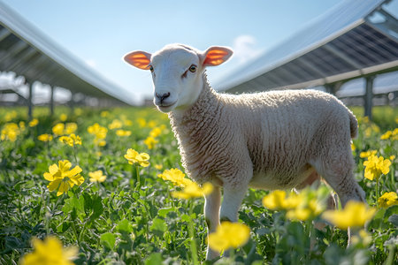 Sheep grazing under solar panels in a vibrant field of yellow flowers symbolizes the harmony between renewable energy and sustainable farming. the scene highlights eco-friendly practices, showcasing a balance between agriculture and technology. Generative AI