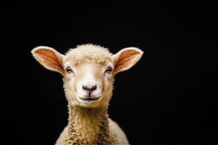 A young lamb stands in front of a solid black background, looking curiously at the viewer. Its fluffy wool and bright eyes create an endearing presence in the studio environment.