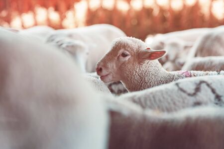 Lamb in sheep pen on dairy farm, cute young animals in paddock