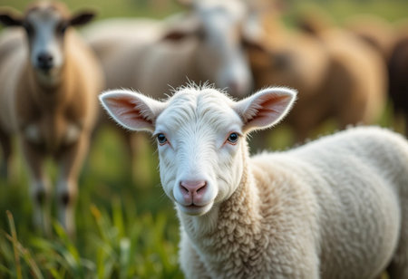 A lamb with sparkling eyes looks curiously at the lens, capturing the innocence and charm of farm life on a beautiful day.
