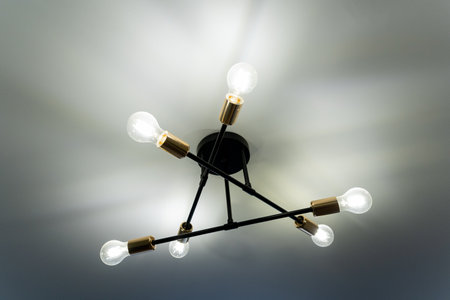 Geometrical golden yellow chandelier on gray ceiling. Illuminating light with shadow lines. Text space